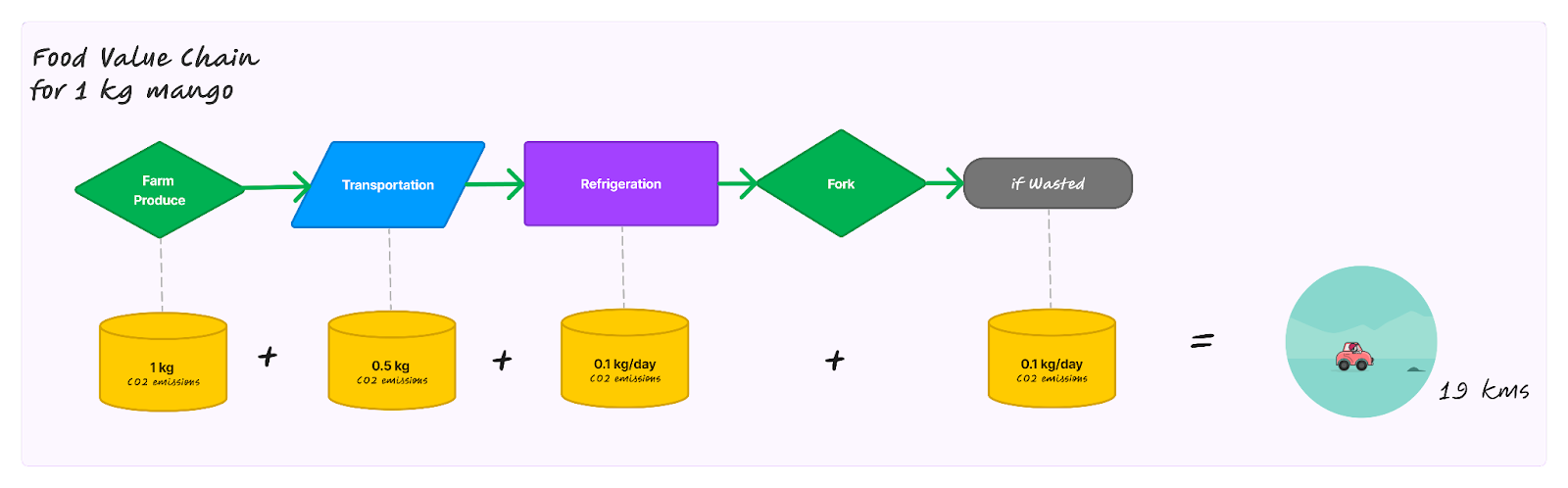 A kg of mango wasted leads to 3.5kgs of CO2 emissions. It is equivalent to CO2 emissions of a car run on fossil fuels for 19 kms OR CO2 emissions from a smartphone charged every day for 10 months.