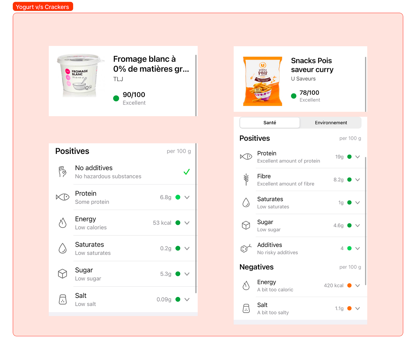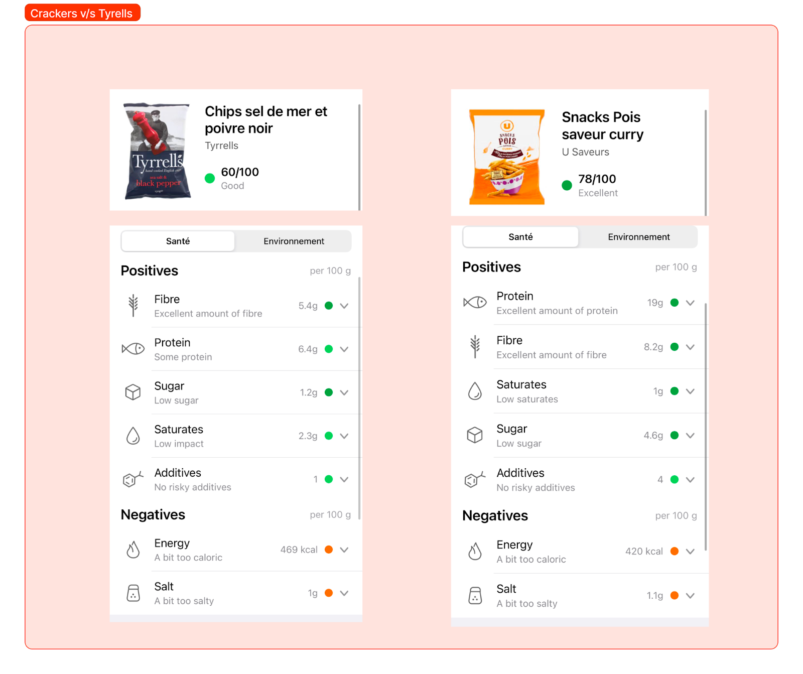 The scores justify comparison between two different food products in the same category: eg. Tyrell’s Chips v/s Yuka recommended Crackers.